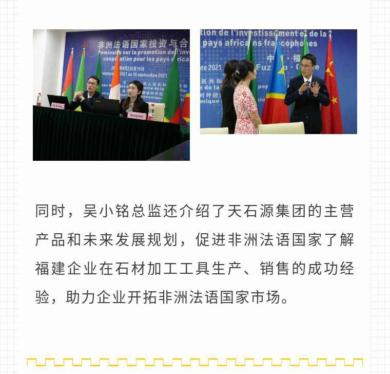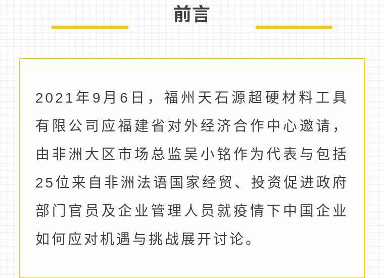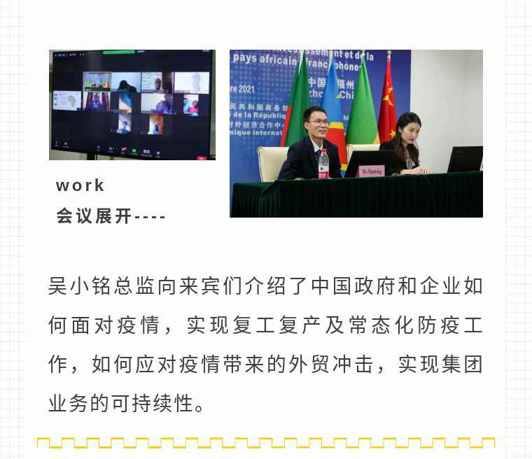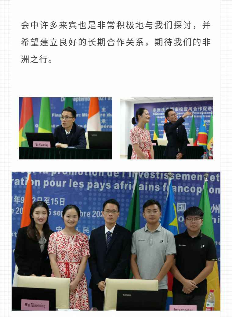 2021年9月6日,大发在线登录官网·(中国)官方网站应福建省对外经济合作中心邀请,由非洲大区市场总监吴小铭作为代表与包括25位来自非洲法语国家经贸、投资促进政府部门官员及企业管理人员就疫情下中国企业如何应对机遇与挑战展开讨论。